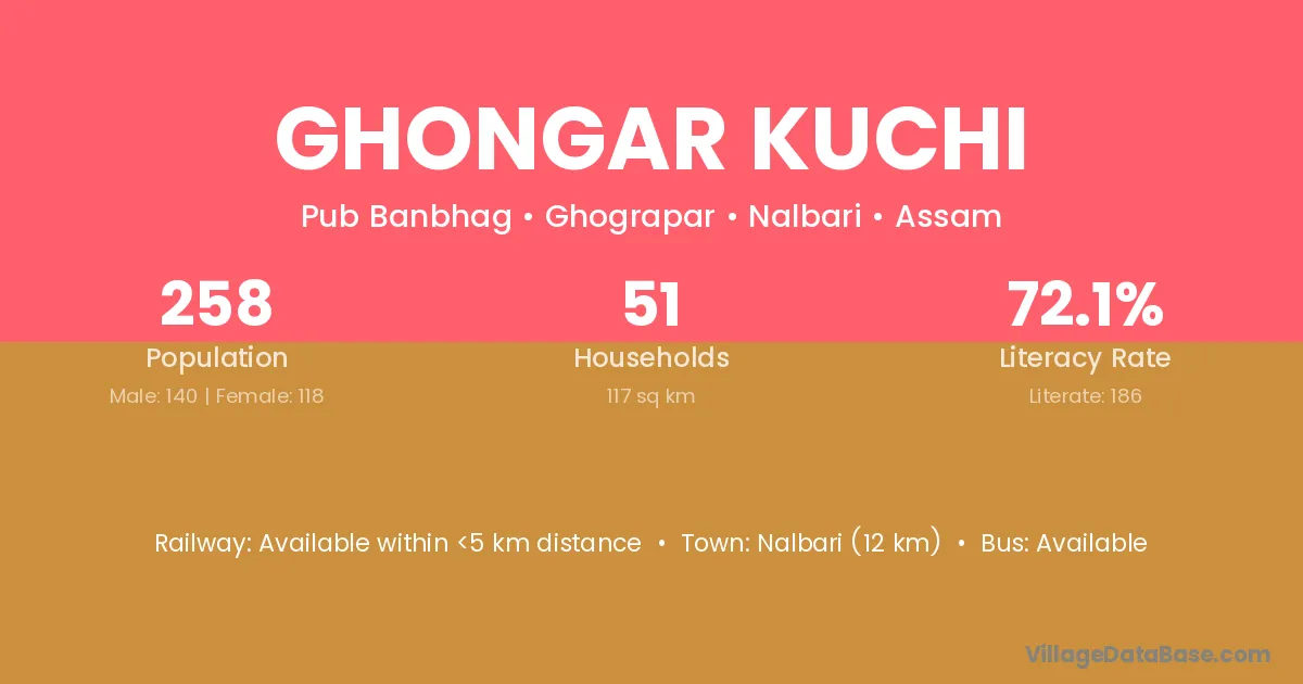 Nalbari (12 km) is the nearest town to Ghongar Kuchi village for major economic activities and is located approximately 12 km away.