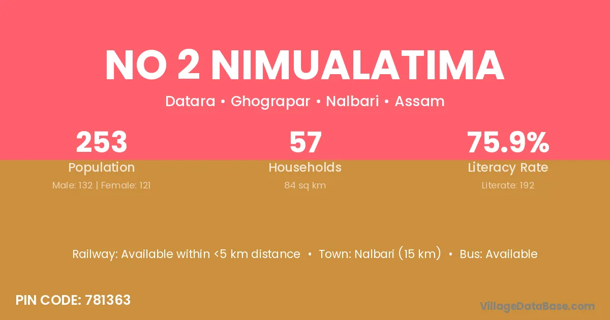 Nalbari (15 km) is the nearest town to No 2 Nimualatima village for major economic activities and is located approximately 15 km away.