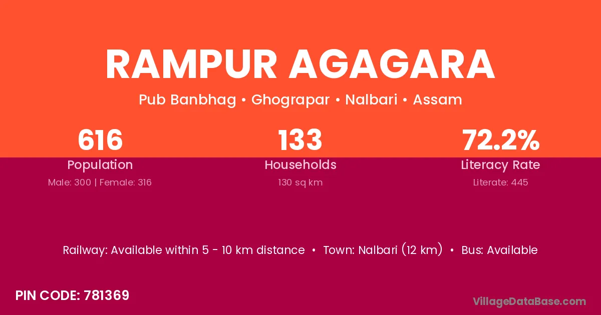 Nalbari (12 km) is the nearest town to Rampur Agagara village for major economic activities and is located approximately 12 km away.