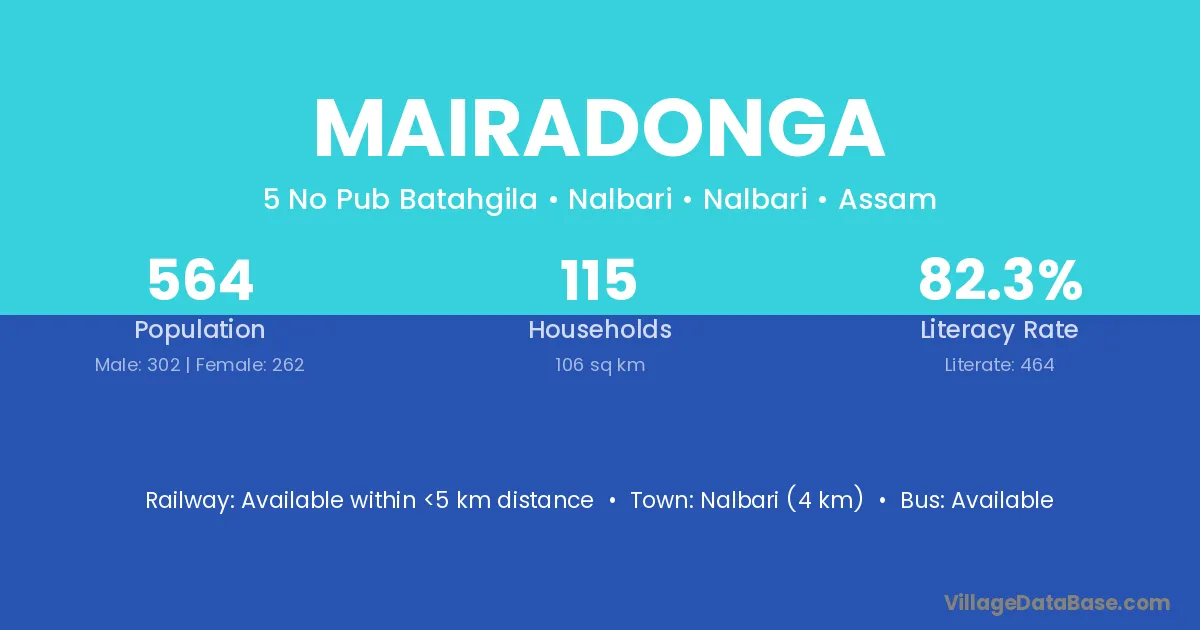 Nalbari (4 km) is the nearest town to Mairadonga village for major economic activities and is located approximately 4 km away.