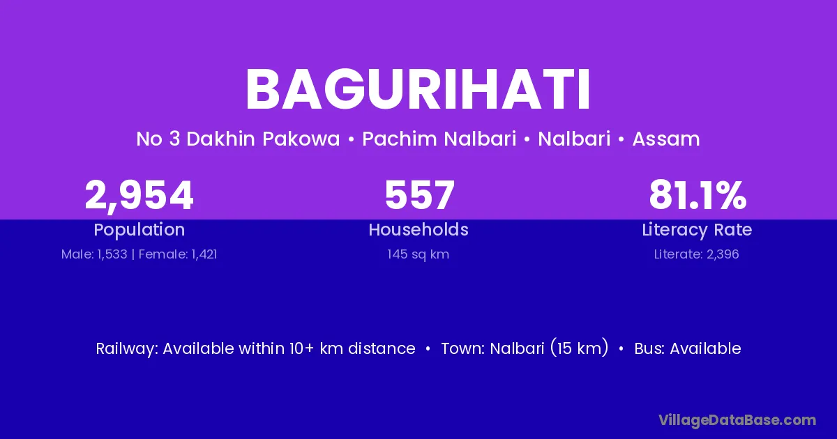 Nalbari (15 km) is the nearest town to Bagurihati village for major economic activities and is located approximately 15 km away.