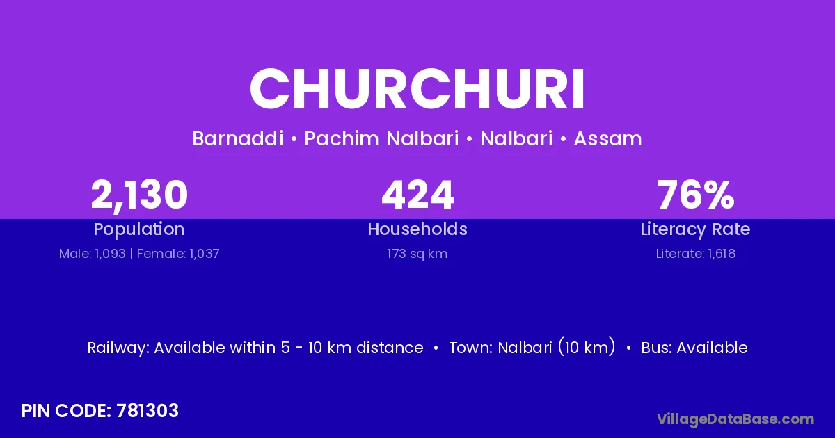 Nalbari (10 km) is the nearest town to Churchuri village for major economic activities and is located approximately 10 km away.