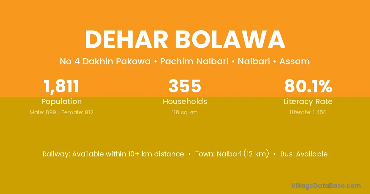 Nalbari (12 km) is the nearest town to Dehar Bolawa village for major economic activities and is located approximately 12 km away.