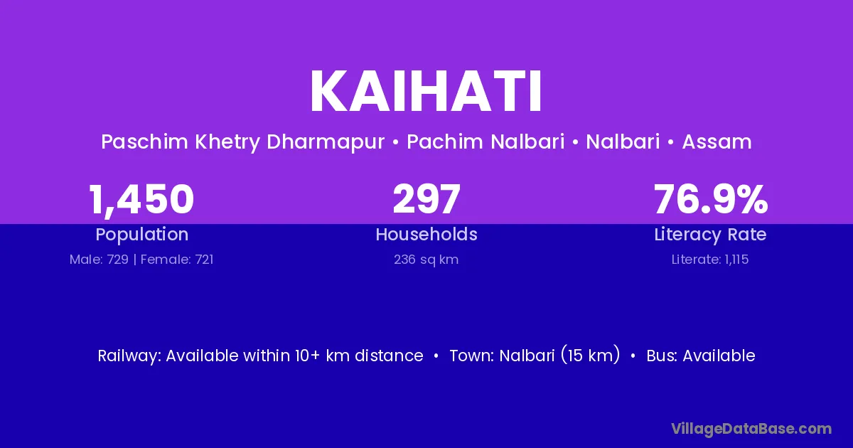 Nalbari (15 km) is the nearest town to Kaihati village for major economic activities and is located approximately 15 km away.