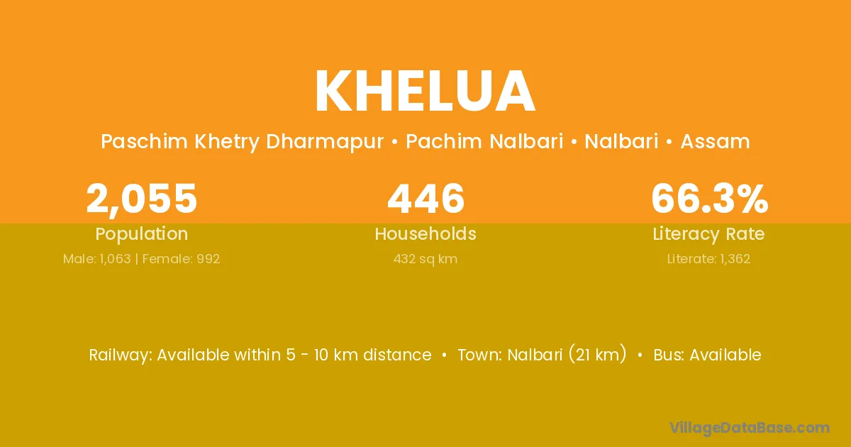 Nalbari (21 km) is the nearest town to Khelua village for major economic activities and is located approximately 21 km away.