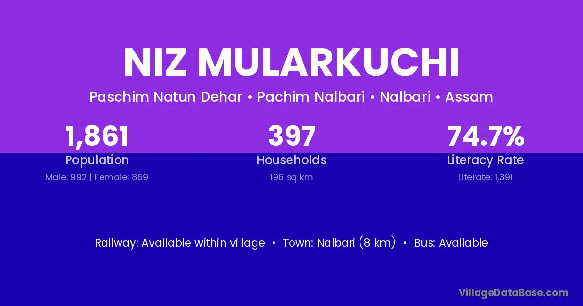 Nalbari (8 km) is the nearest town to Niz Mularkuchi village for major economic activities and is located approximately 8 km away.