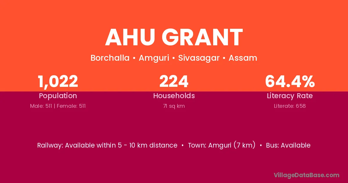 Amguri (7 km) is the nearest town to Ahu Grant village for major economic activities and is located approximately 7 km away.