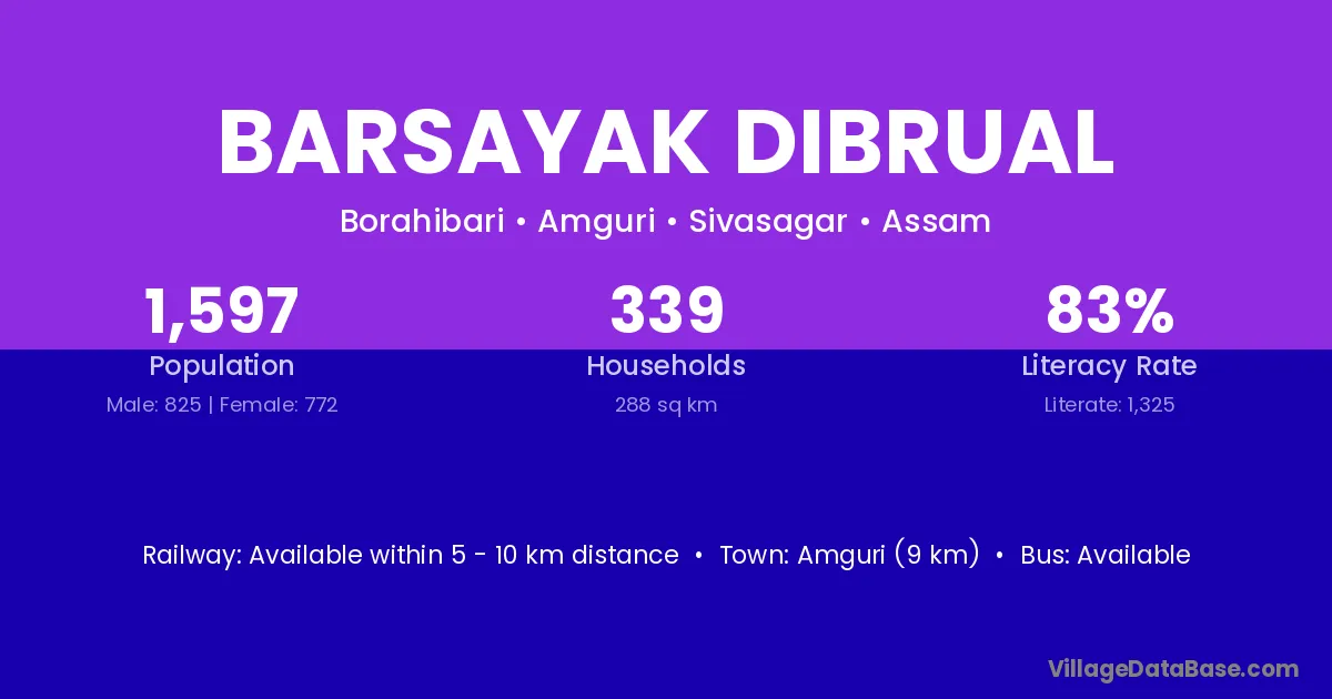 Amguri (9 km) is the nearest town to Barsayak Dibrual village for major economic activities and is located approximately 9 km away.