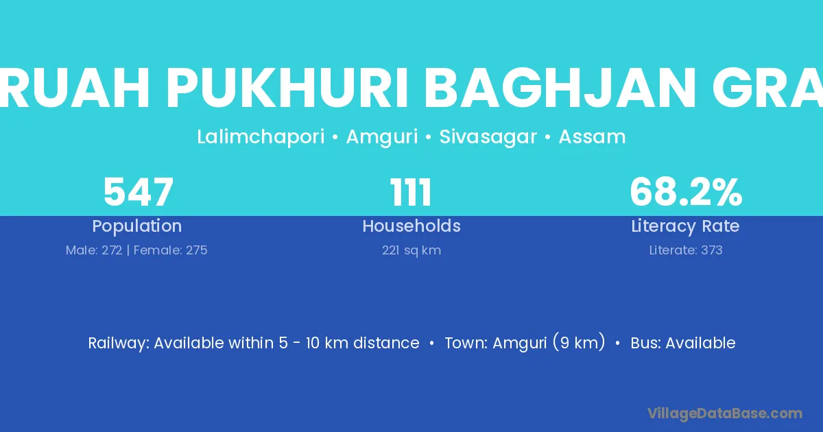 Baruah Pukhuri Baghjan Grant village has a total population of 547 people, of which 272 are males and 275 are females.