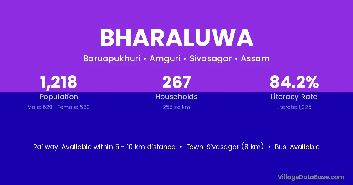 Sivasagar (8 km) is the nearest town to Bharaluwa village for major economic activities and is located approximately 8 km away.