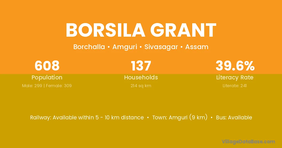 Amguri (9 km) is the nearest town to Borsila Grant village for major economic activities and is located approximately 9 km away.