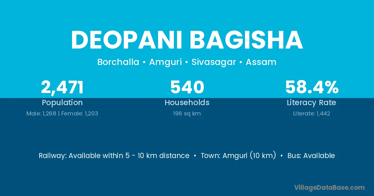 Amguri (10 km) is the nearest town to Deopani Bagisha village for major economic activities and is located approximately 10 km away.
