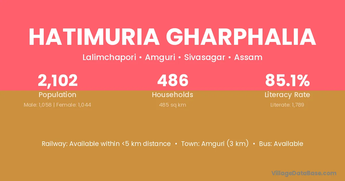 Amguri (3 km) is the nearest town to Hatimuria Gharphalia village for major economic activities and is located approximately 3 km away.