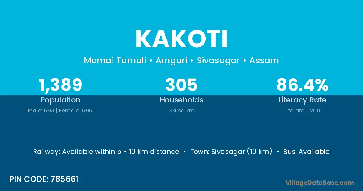 Sivasagar (10 km) is the nearest town to Kakoti village for major economic activities and is located approximately 10 km away.