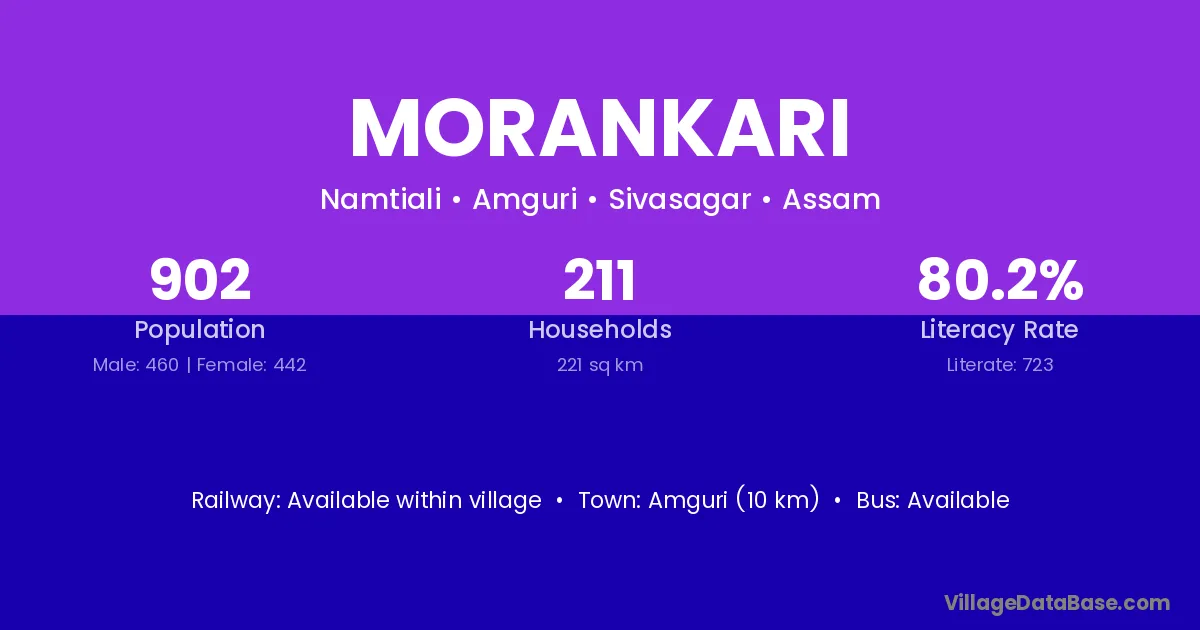 Amguri (10 km) is the nearest town to Morankari village for major economic activities and is located approximately 10 km away.