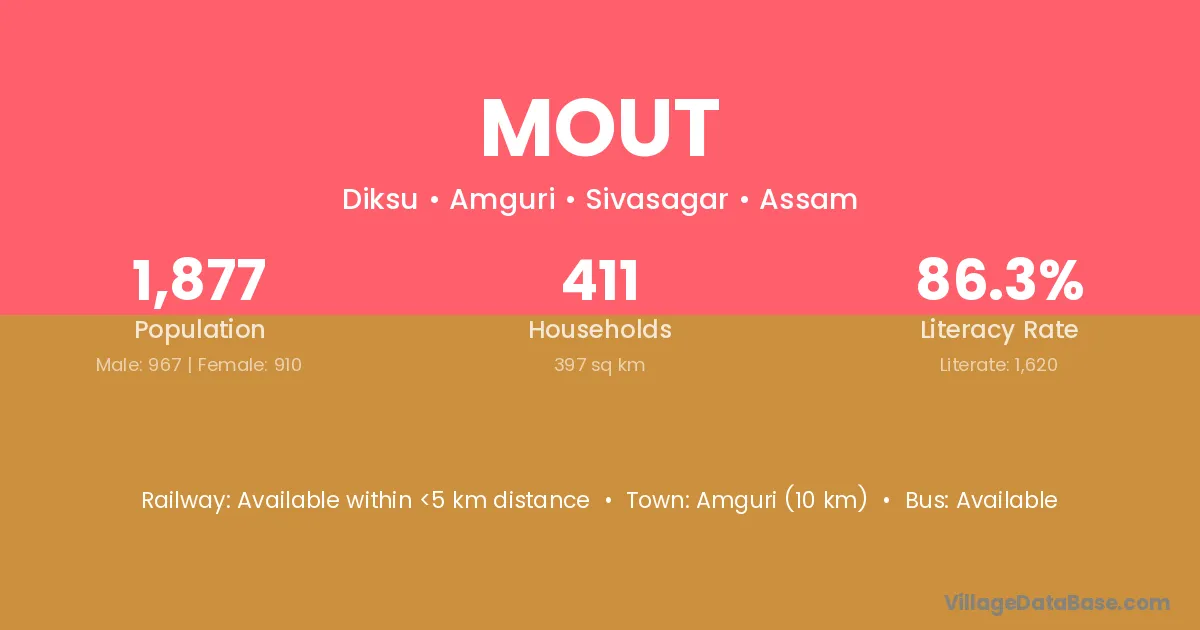Amguri (10 km) is the nearest town to Mout village for major economic activities and is located approximately 10 km away.