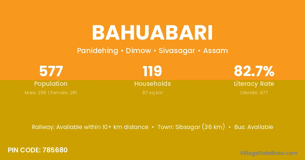 Sibsagar (36 km) is the nearest town to Bahuabari village for major economic activities and is located approximately 36 km away.