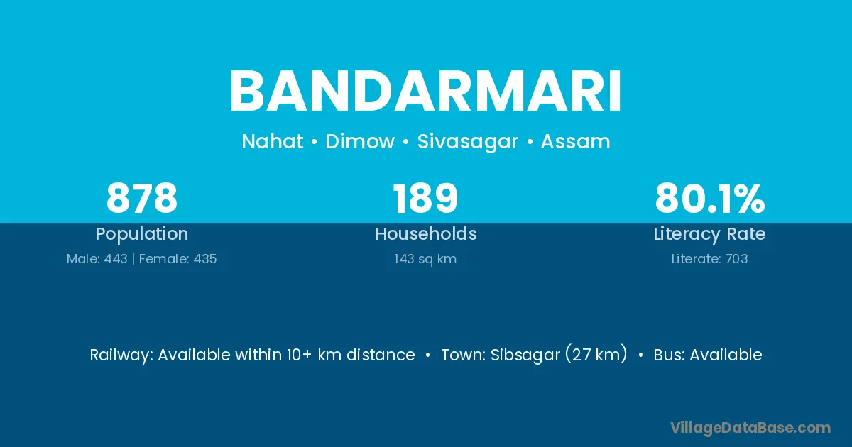 Sibsagar (27 km) is the nearest town to Bandarmari village for major economic activities and is located approximately 27 km away.