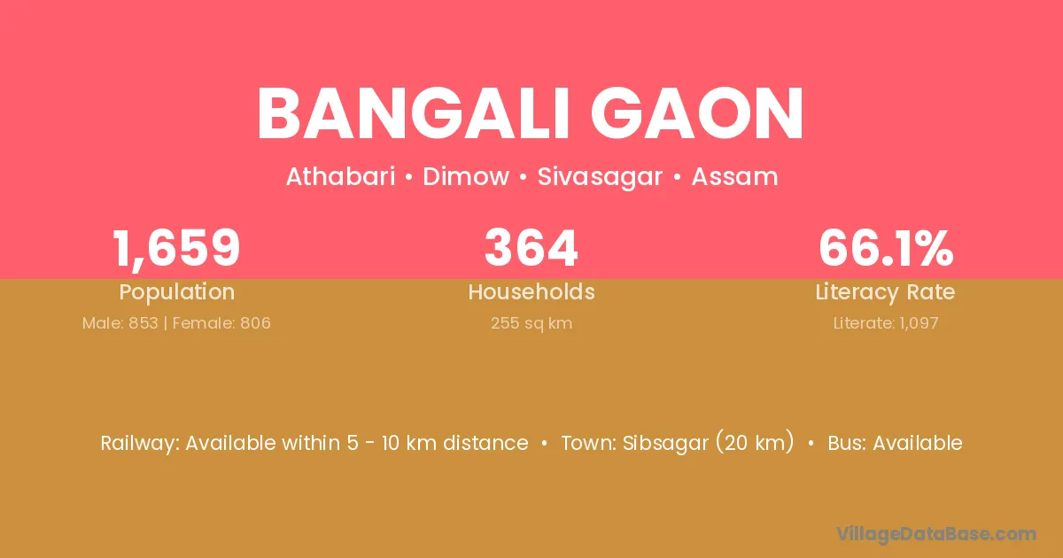 Bangali Gaon village has a total population of 1,659 people, of which 853 are males and 806 are females.