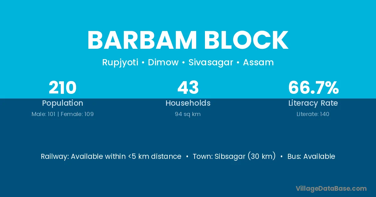 Sibsagar (30 km) is the nearest town to Barbam Block village for major economic activities and is located approximately 30 km away.