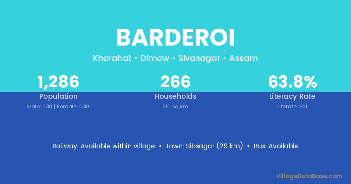 Sibsagar (29 km) is the nearest town to Barderoi village for major economic activities and is located approximately 29 km away.