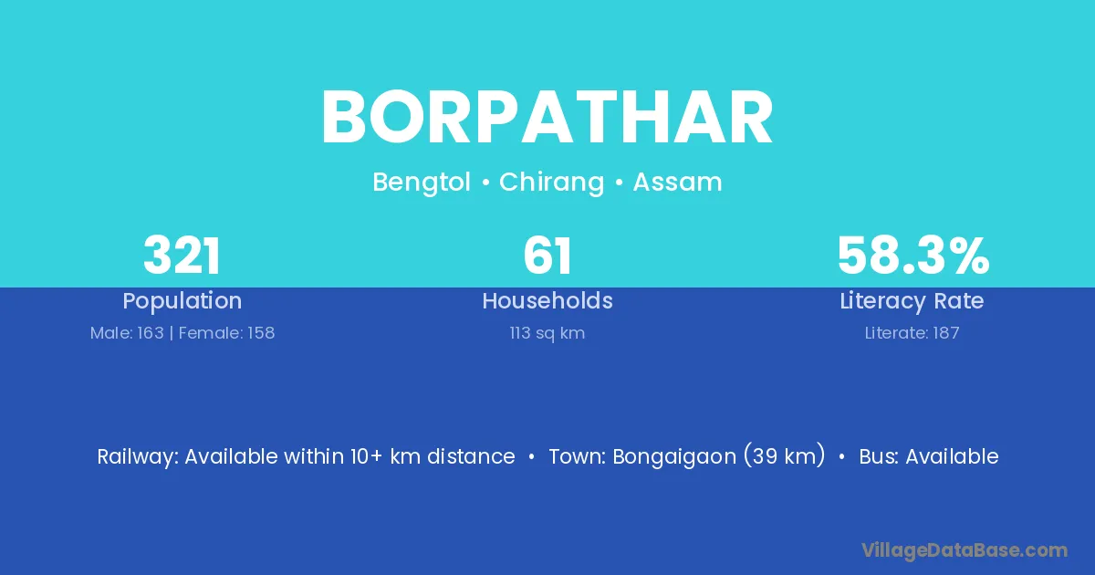 The literacy rate of Borpathar village is 61.09%. Male literacy stands at 69.57% and female literacy at 53.23%.