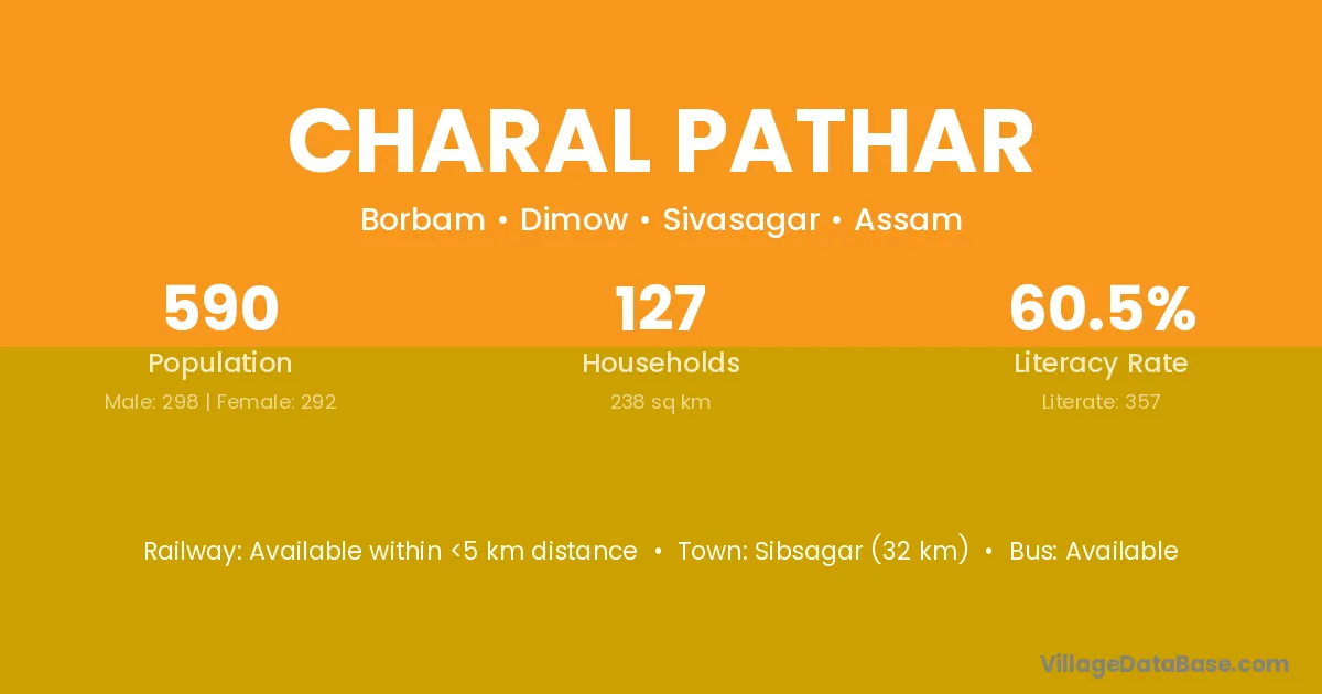 Sibsagar (32 km) is the nearest town to Charal Pathar village for major economic activities and is located approximately 32 km away.