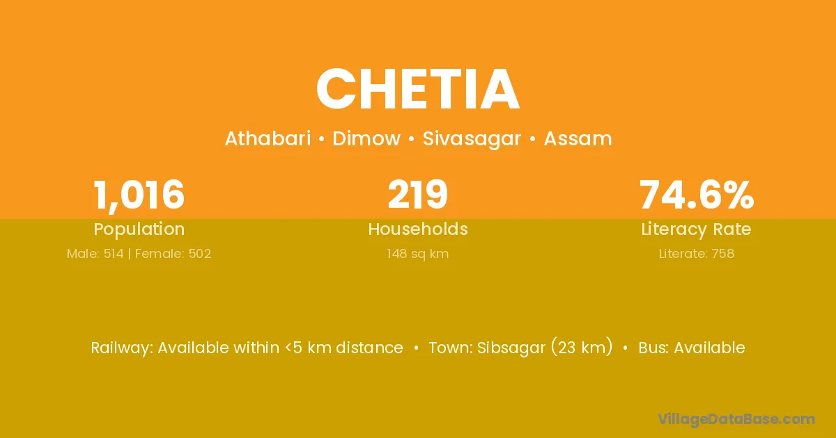 Chetia village has a total population of 1,016 people, of which 514 are males and 502 are females.