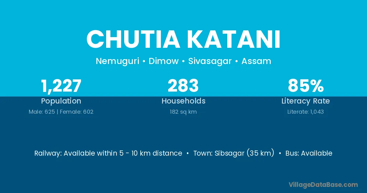 Chutia Katani village has a total population of 1,227 people, of which 625 are males and 602 are females.