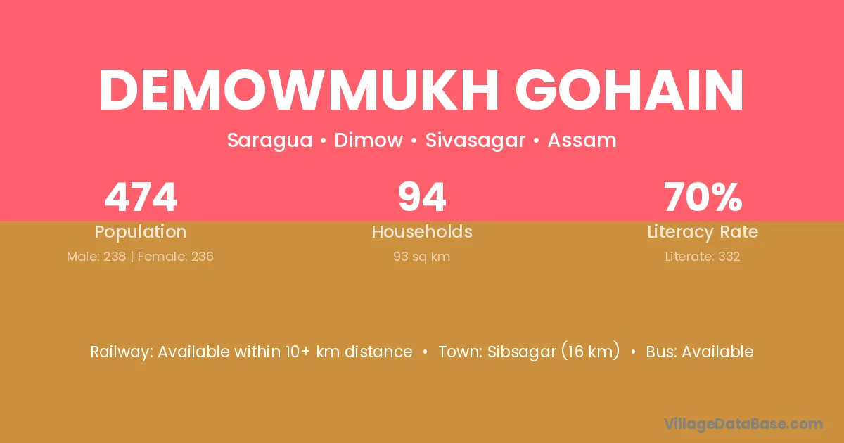 Demowmukh Gohain village has a total population of 474 people, of which 238 are males and 236 are females.