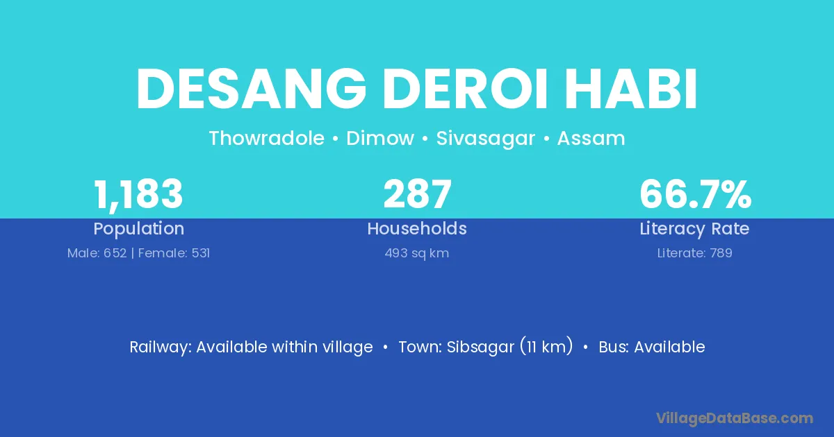 Sibsagar (11 km) is the nearest town to Desang Deroi Habi village for major economic activities and is located approximately 11 km away.