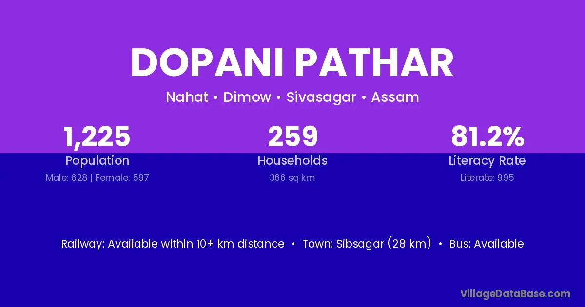 Sibsagar (28 km) is the nearest town to Dopani Pathar village for major economic activities and is located approximately 28 km away.