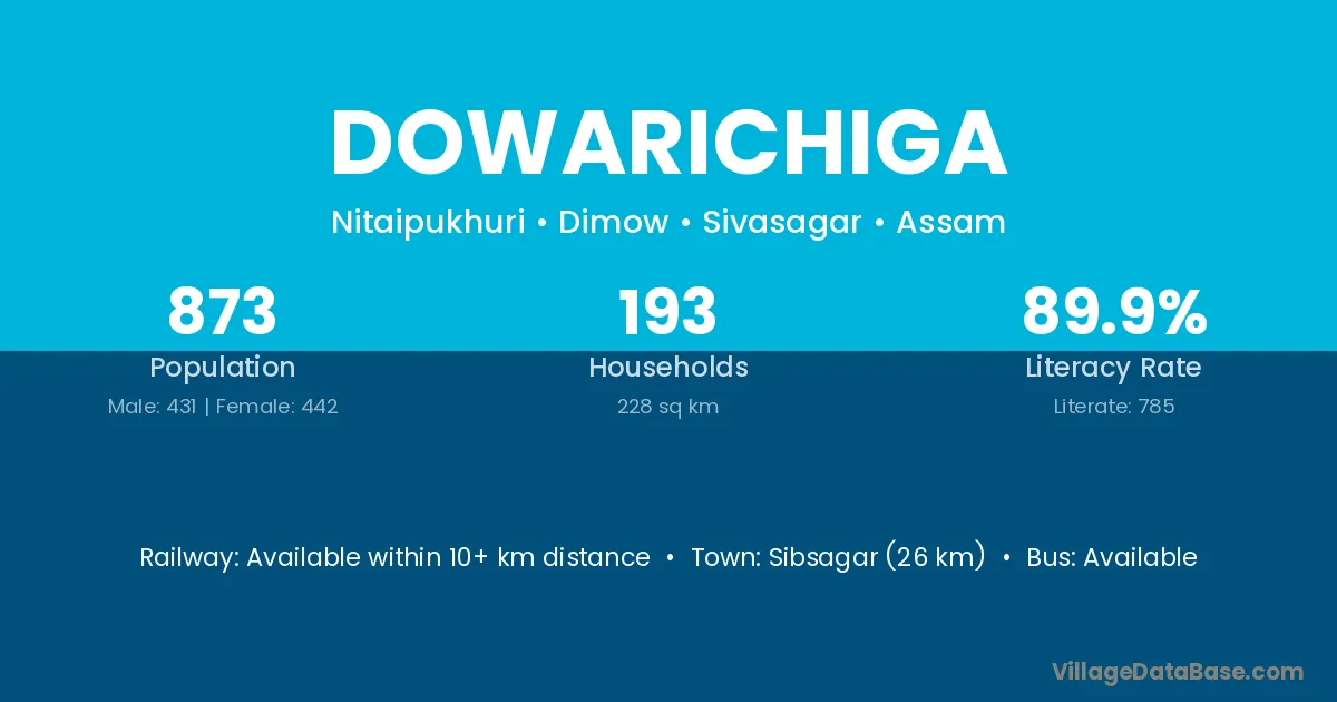 Sibsagar (26 km) is the nearest town to Dowarichiga village for major economic activities and is located approximately 26 km away.