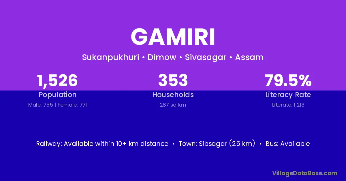 Sibsagar (25 km) is the nearest town to Gamiri village for major economic activities and is located approximately 25 km away.