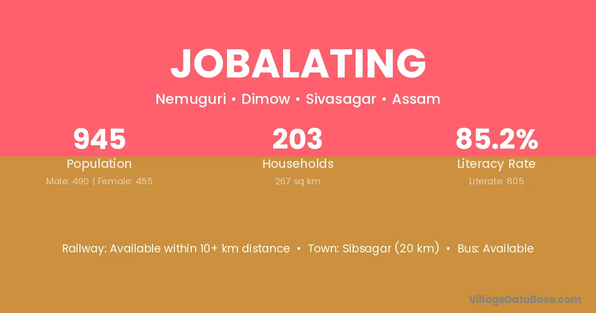Sibsagar (20 km) is the nearest town to Jobalating village for major economic activities and is located approximately 20 km away.