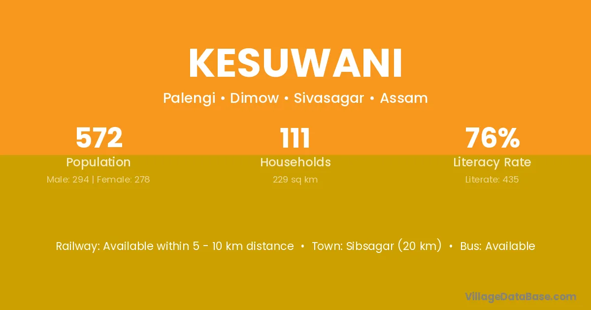 Sibsagar (20 km) is the nearest town to Kesuwani village for major economic activities and is located approximately 20 km away.