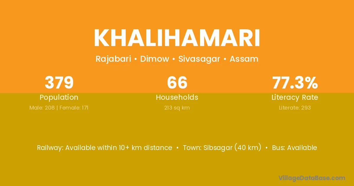 Sibsagar (40 km) is the nearest town to Khalihamari village for major economic activities and is located approximately 40 km away.