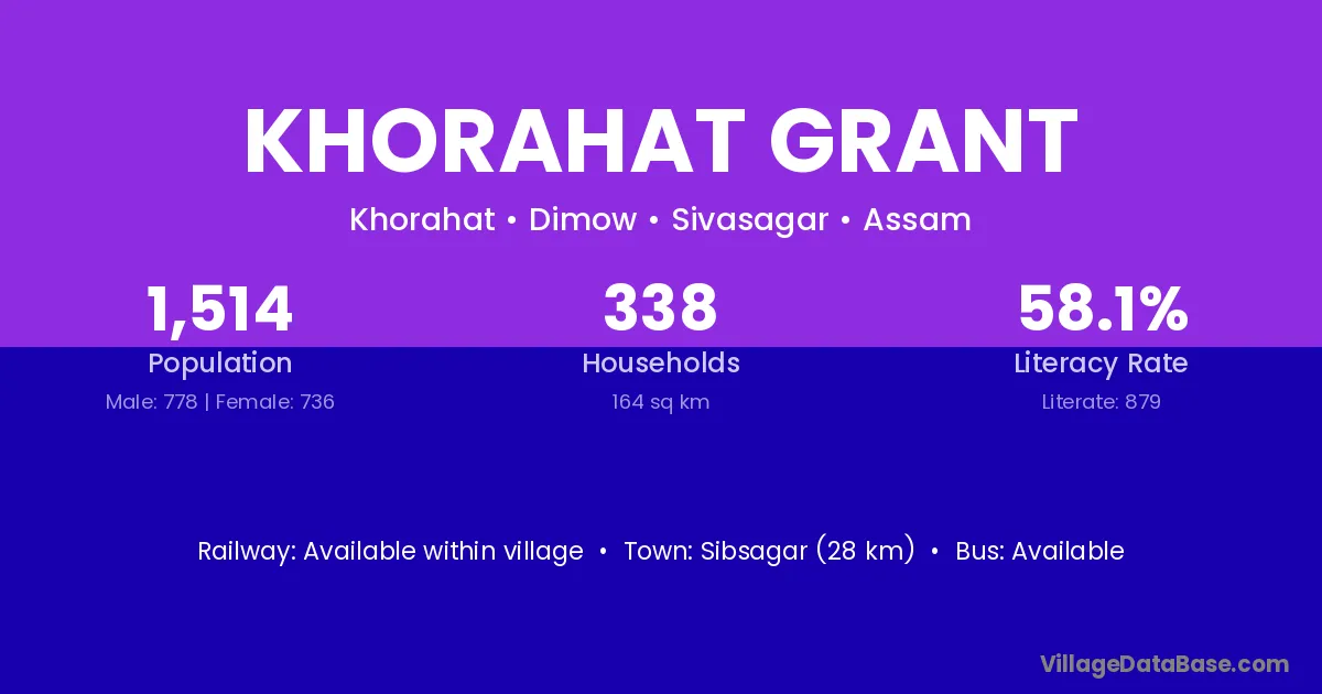 Sibsagar (28 km) is the nearest town to Khorahat Grant village for major economic activities and is located approximately 28 km away.