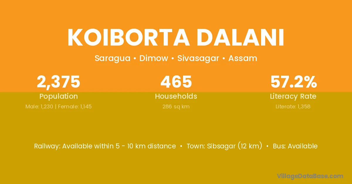 Sibsagar (12 km) is the nearest town to Koiborta Dalani village for major economic activities and is located approximately 12 km away.