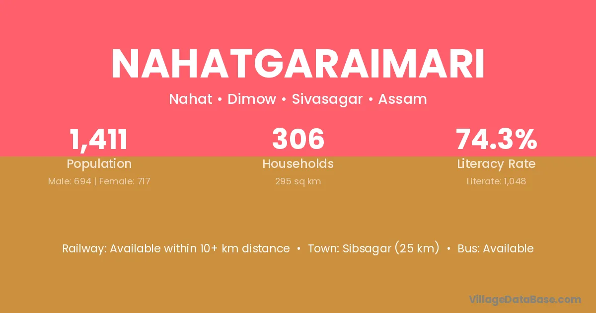 Sibsagar (25 km) is the nearest town to Nahatgaraimari village for major economic activities and is located approximately 25 km away.