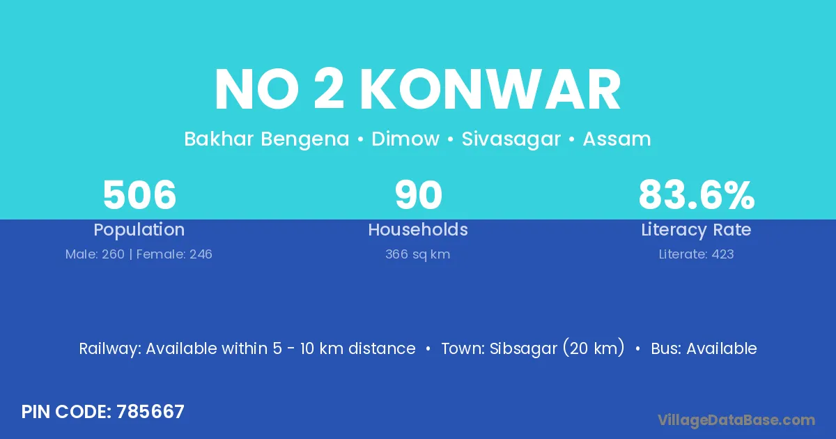 Sibsagar (20 km) is the nearest town to No 2 Konwar village for major economic activities and is located approximately 20 km away.