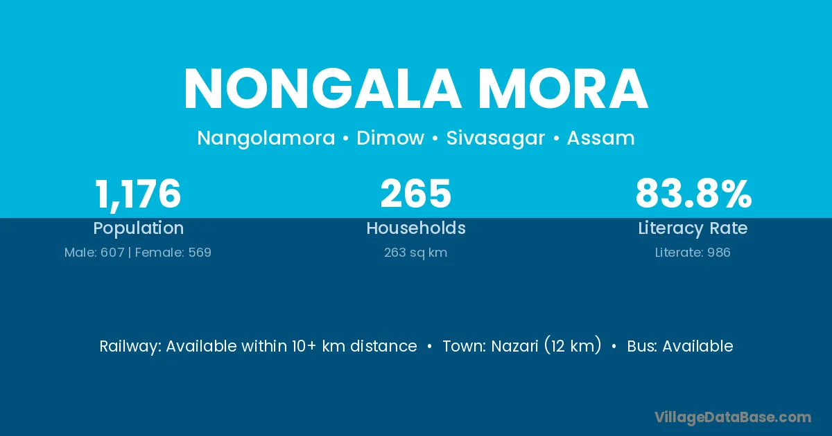 Nazari (12 km) is the nearest town to Nongala Mora village for major economic activities and is located approximately 12 km away.