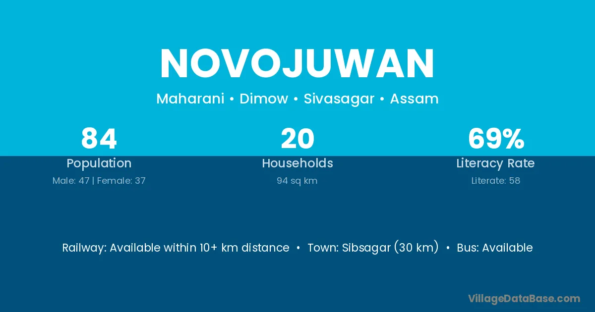 Sibsagar (30 km) is the nearest town to Novojuwan village for major economic activities and is located approximately 30 km away.