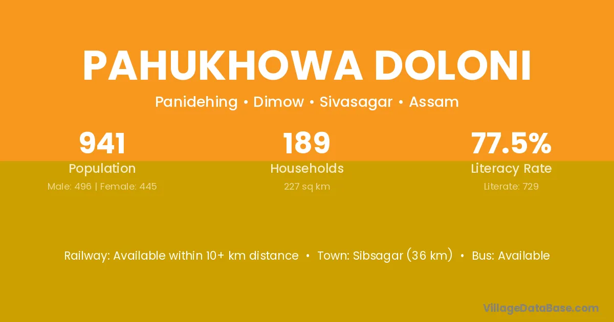 Sibsagar (36 km) is the nearest town to Pahukhowa Doloni village for major economic activities and is located approximately 36 km away.