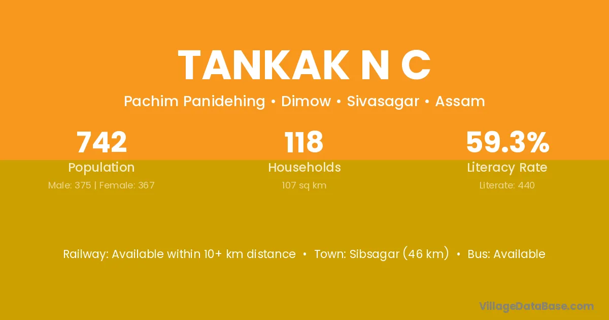 Sibsagar (46 km) is the nearest town to Tankak N C village for major economic activities and is located approximately 46 km away.