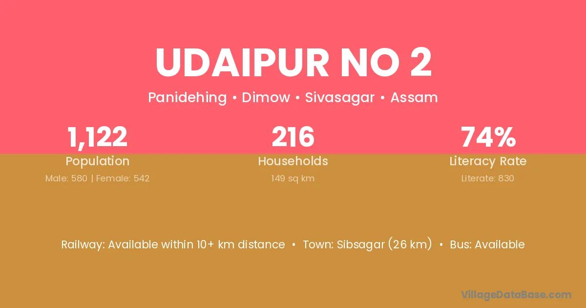 Sibsagar (26 km) is the nearest town to Udaipur No 2 village for major economic activities and is located approximately 26 km away.