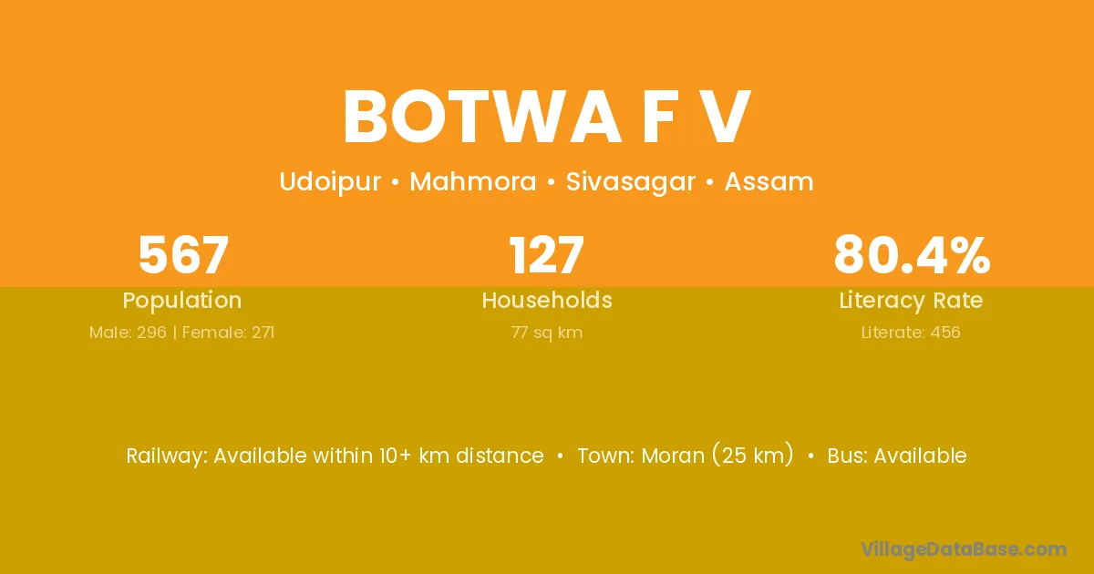Moran (25 km) is the nearest town to Botwa F V village for major economic activities and is located approximately 25 km away.