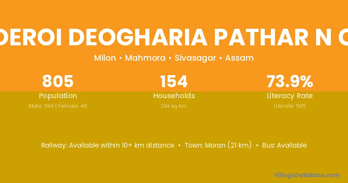 Moran (21 km) is the nearest town to Deroi Deogharia Pathar N C village for major economic activities and is located approximately 21 km away.