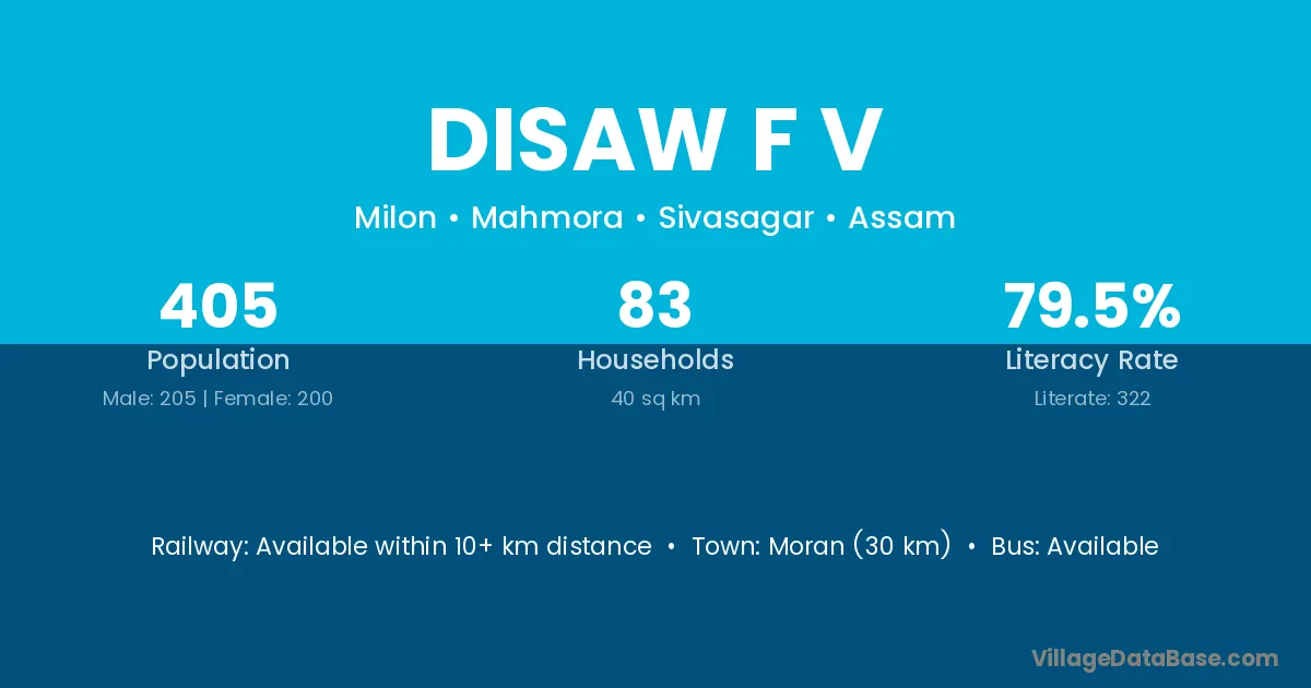 Moran (30 km) is the nearest town to Disaw F V village for major economic activities and is located approximately 30 km away.