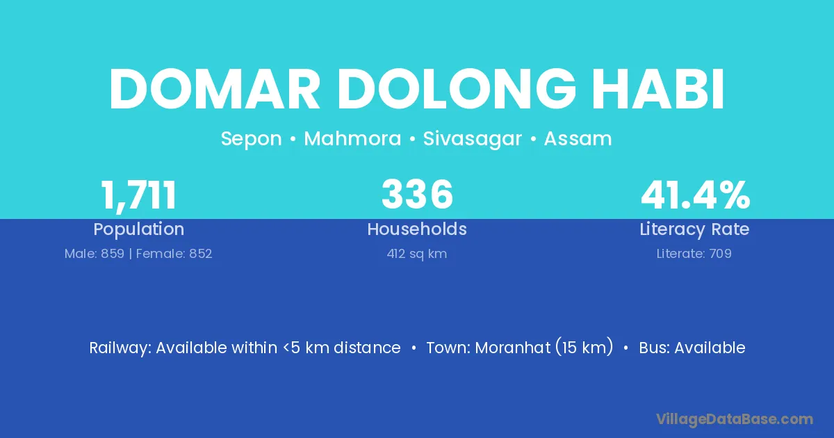 Domar Dolong Habi village has a total population of 1,711 people, of which 859 are males and 852 are females.